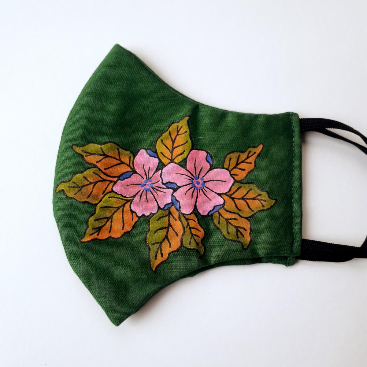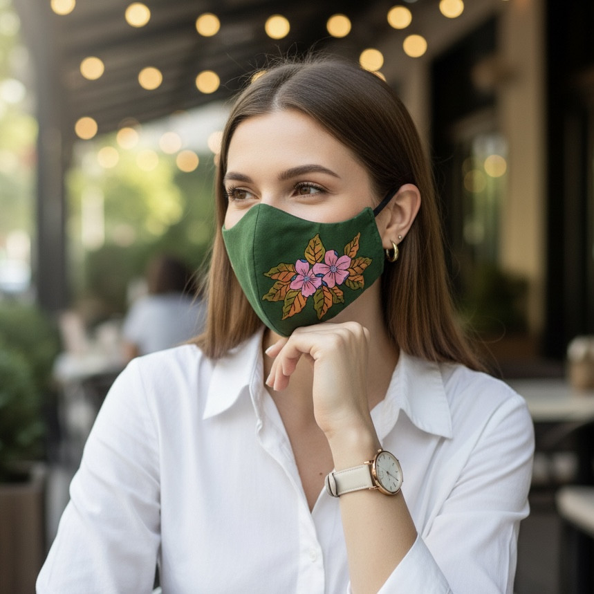Bahan : 100% Cotton (Adem, lembut, dan sirkulasi udara halus). Warna: Tersedia lebih dari 10+ pilihan warna kain. Teknik: Dilukis dengan tangan menggunakan cat kain khusus. Model: Tersedia model Earloop dan Headloop (Hijab Friendly). Perawatan : Cuci secara lembut dengan tangan untuk menjaga keawetan lukisan.